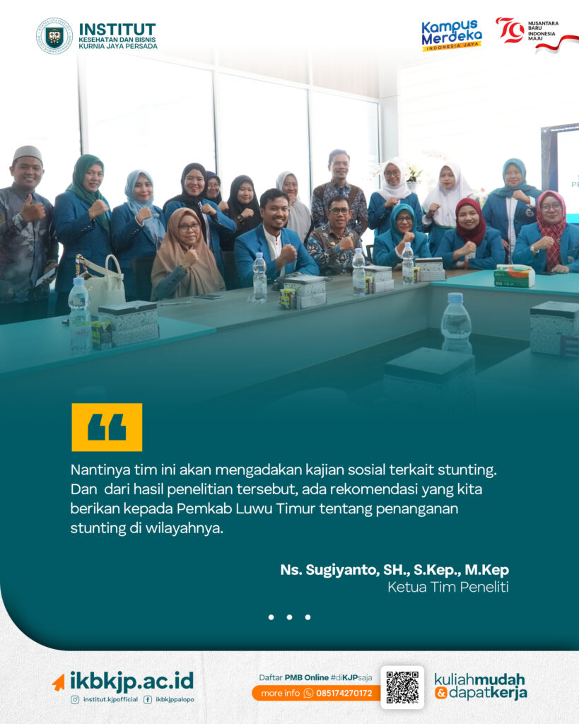 Ketua Tim Peneliti, Ns. Sugiyanto, SH., S.Kep., M.Kep., mengatakan, penandatangan kontrak penelitian ini merupakan tindak-lanjut dari MoU antara IKB KJP dengan Pemkab Lutim dalam hal penelitian dengan judul “Kajian Aspek Sosial Penanganan Stunting di Kabupaten Luwu Timur”.
