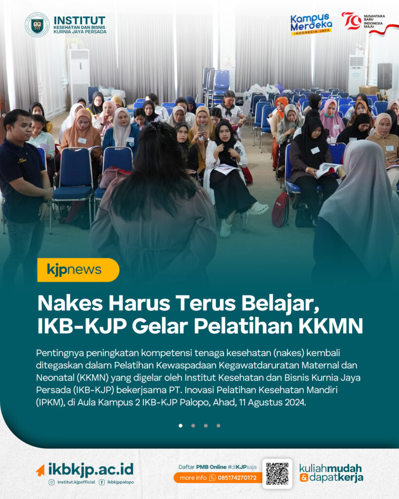 KJPNews – Pentingnya peningkatan kompetensi tenaga kesehatan (nakes) kembali ditegaskan dalam Pelatihan Kewaspadaan Kegawatdaruratan Maternal dan Neonatal (KKMN) yang digelar oleh Institut Kesehatan dan Bisnis Kurnia Jaya Persada (IKB-KJP) bekerjsama PT. Inovasi Pelatihan Kesehatan Mandiri (IPKM), di Aula Kampus 2 IKB-KJP Palopo, Ahad, 11 Agustus 2024.